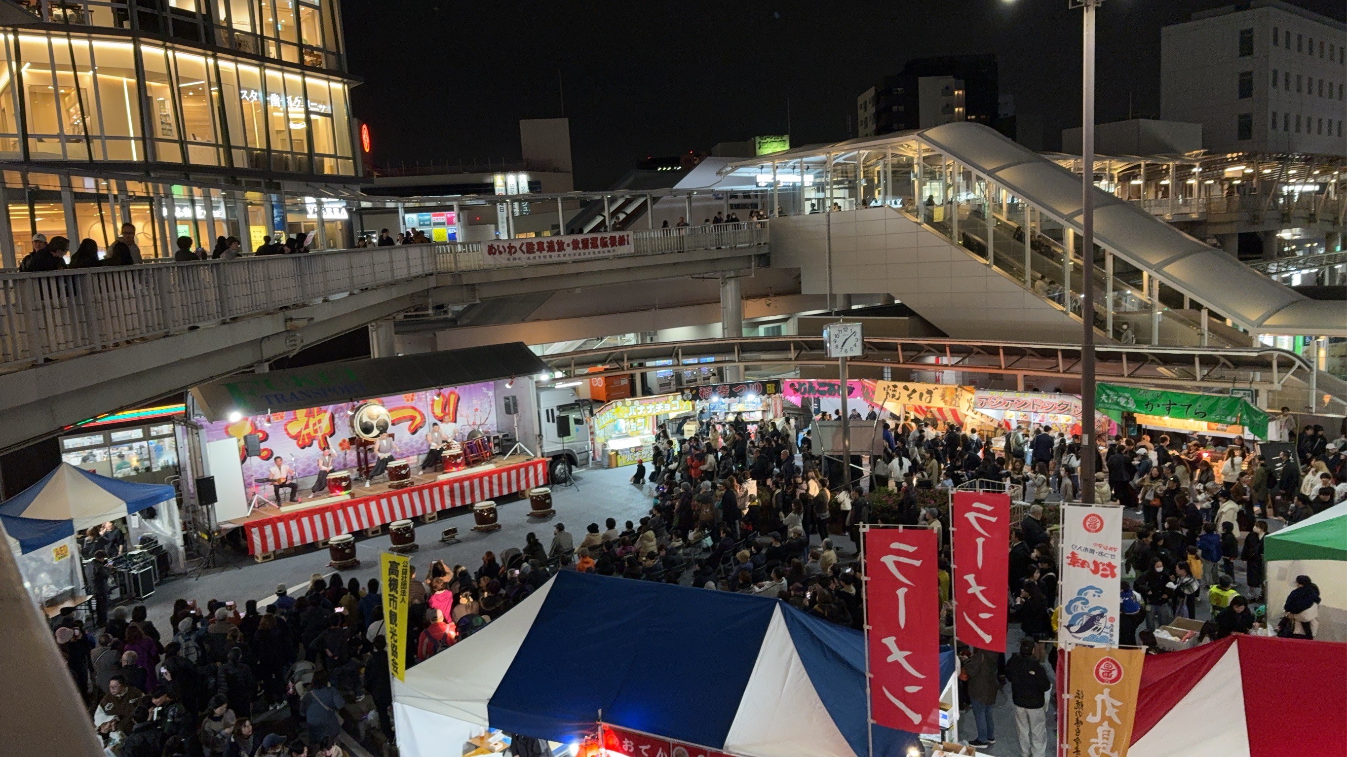 2月26日の帰宅途中、高槻駅前から上宮天満宮にかけて、天神まつりが賑やかに行われていました。菅原道真公の命日に合わせて毎年2月25日と26日は、この時期の高槻の風物詩となっています。例年天神祭はとても寒いのですがこの日は夜になっても暖かく、とてもたくさんのお客さんがお祭りを楽しんでいました。特設ステージではちょうど和太鼓の演奏が!躍動的なリズムと迫力ある音に元気をもらいました。